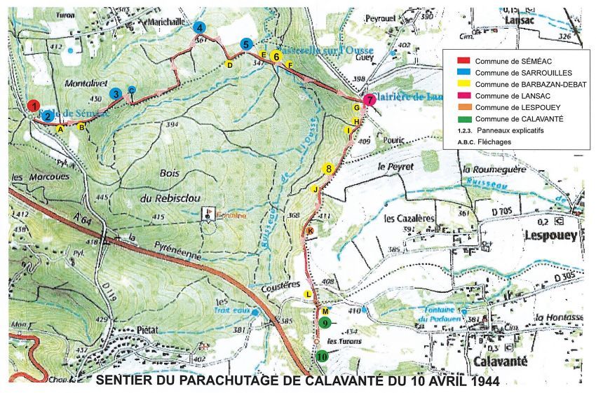Derrière la stèle, un sentier, sentier mémoriel, long de 4 km que l’on pourrait nommer "Sentier des parachutages". Des résistants, de nuit et bravant le couvre-feu, empruntaient ce sentier, pour récupérer des containers métalliques largués par l’aviation anglaise dans un champ de Calavanté près de la ferme de Jean Guinle, ou vivent actuellement Monique Lacoste, sa petite fille, et Robert. Ces containers étaient remplis d’armes, de munitions, de nourriture et de messages des forces alliées. Ce sentier des patriotes, déjà tracé, accessible à tous, fait l’objet d’une réflexion afin qu’il soit classé très prochainement comme un sentier du souvenir, avec l’installation officielle de deux panneaux du souvenir, l’un à Semeac, l’autre à Calavanté »